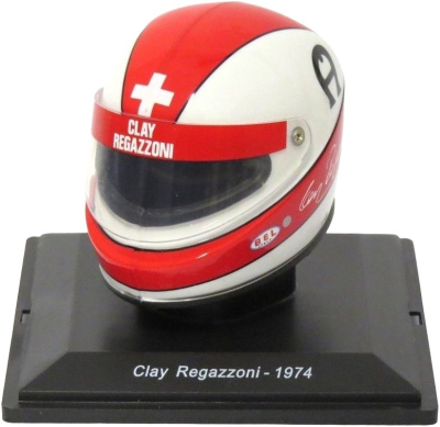 Spark 1:5 resin helmet, Clay Regazzoni Ferrari F1 312/B3 helmet from the 1974 F1 season, with acrylic case in blister pack.