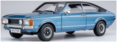 Touring Model Cars 1:18 model of the Ford Granada Coupe Series 2 in Metallic Blue with Black vinyl roof from 1975. Limited edition of 702 pieces with full openings.