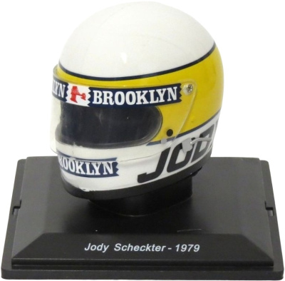 Spark 1:5 resin helmet, Jody Scheckter Ferrari 312T3 1979. With acrylic case in blister pack.