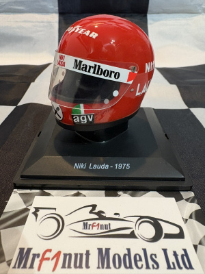 Spark 1:5 resin model of Niki Lauda's Ferrari 312 T2 Helmet from the 1975 World Championship season, with tobacco livery applied as shown. With acrylic case in blister pack.