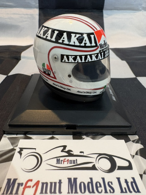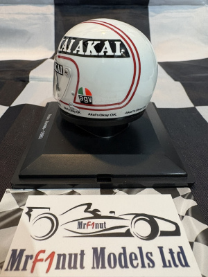 Spark 1:5 resin model of Alain Jones Williams FW07B helmet from the 1980 World Championship season, with tobacoo livery applied as shown. Wtih acrylic case in blister pack.