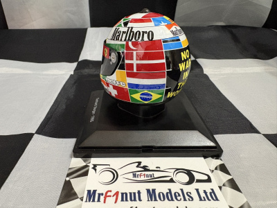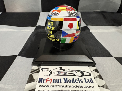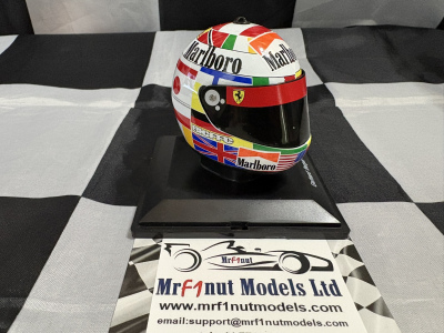 Spark 1:5 resin model of the Ferrari 412 T2 helmet from the 1995 F1 Driver's Championship, with tobacco livery applied as shown. With acrylic case in blister pack. Available now on back-order (approx.2 weeks).