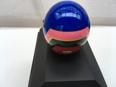 Minichamps 1:8 scale diecast helmet; Jacques Villeneuve whilst driving to his maiden F1 Drivers Championship with Williams in 1997. Please note this item has been pre-loved and comes with perspex lid.