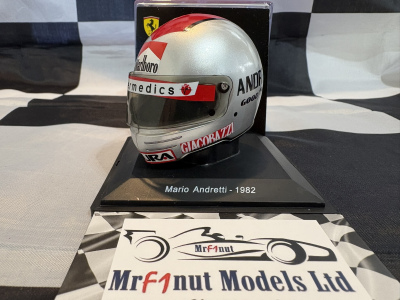 Spark 1:5 resin model of Mario Andretti's Ferrari 126 C2 helmet from the 1982 F1 season, with tobacco livery applied as shown. With acrylic case in blister pack